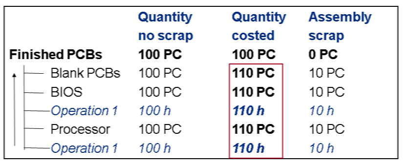 For example, you plan to produce 100 Printed Circuit Boards PCBs. Plan assembly scrap increases component and activity quantities by 10%, as shown in the Quantity costed column in Figure 1.